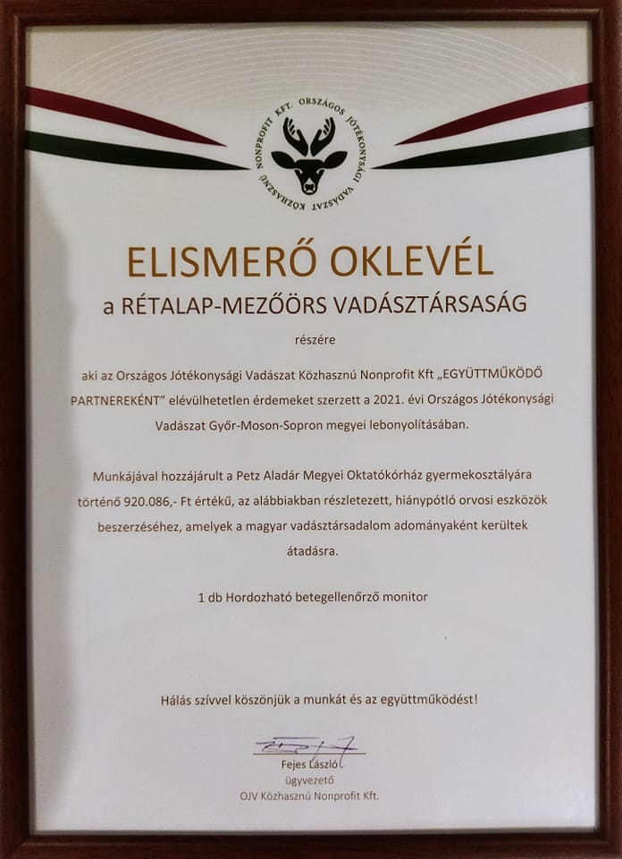 A Rétalap-Mezőörs Vadásztársaság területe Győrtől 24 km-re, Mezőörs és környékén, közel 3100 ha-on helyezkedik el. A mezőgazdasági területrészek kitűnő élőhelyet biztosítanak az itt élő apróvad és őzállomány számára. A tagságot főleg helyi és környékbeli vadászok alkotják A terület legfőbb vadfaja az őz, az éves teríték 21 db bak, 17 suta és 23 db gida. Gím és Dámszarvas csak átvonulóban, muflon még sohasem fordult elő a vadászterületen. Az elmúlt években átlagosan 120 db nagyvadat ejtettünk, ennek jelentős része vaddisznó és őz.